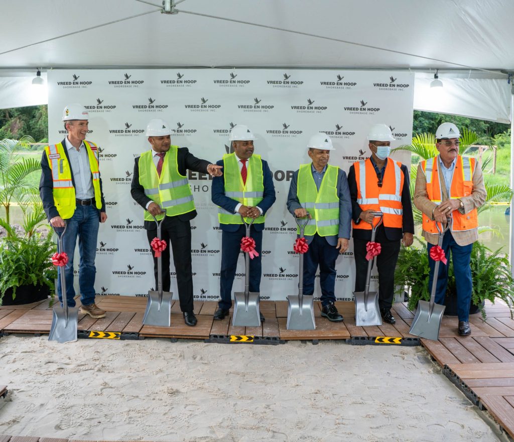 The sod for the GY$62.7 billion Vreed-en-Hoop Shore Base facility on the West Coast of Demerara was officially turned on Tuesday, signalling the start of construction.The shore base is being undertaken by Vreed-en-Hoop Shorebase Incorporated (VEHSI), a joint venture between NRG Holdings – a consortium of local businesses and Jan De Nul – an international maritime infrastructure company.The consortium comprises three local entrepreneurs: gold miner Andron Alphonso of ZRN Investment Inc; Azruddin Mohamed of HADI’S World Incorporated; and Nicholas Deygoo-Boyer of National Hardware Guyana Ltd.In April last, VEHSI landed a contract with ExxonMobil Guyana to support future construction activities of the oil and gas giant. Through the contract, ExxonMobil Guyana will use this shore base to conduct more of its needed fabrication works.Speaking at the sod-turning, President of ExxonMobil Guyana Alistair Routledge noted that the project is a “key milestone” in the development of Region Three (Essequibo Islands-West Demerara).[caption id="attachment_140783" align="aligncenter" width="737"]