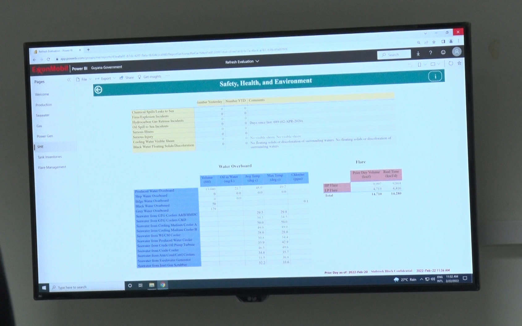 The step-up in the EPA’ situation room for real-time monitoring of activities on the Liza Destiny oil ship, offshore Guyana (Photo: News Room/February 22, 2022)[/caption]On Tuesday, at the EPA’s Head Office in Georgetown, Head of the Agency’s Oil and Gas Unit Joel Gravesande gave the media a simple play-by-play of how exactly the system works in the “Situation Room” to capture information on the Liza Destiny oil ship docked in the Stabroek Block.With sensors tagged on the ship, the EPA will have access to production numbers, gas levels and power generation“We can also monitor chemical spills, if they were in chemical spills, fires, hydrocarbon gas releases, oil spills, illnesses, injuries, cooling water, if there's any visible sheen when the cooling water is discharged, and blackwater, if there is any solid or discolouration with it,” he explained.The real-time monitoring system also allows the EPA to monitor the flare valves aboard the Liza Destiny, Gravesande explained.“You could see the flash gas flash gas compressor, and the main gas compressor and of course, the gas that is being flared right now, in real-time,” he added.In addition to that, the agency can monitor flaring levels using a satellite that can track thermal heat signatures.And according to Reshana Thomas, the EPA’s Geographic Information System (GIS) Specialist, the agency can determine whether flaring activities exceed the mandated levels outlined in the Environmental Permits.If the levels reach a peak, Thomas noted that an email alert is sent to the Director and other officers within the Situation Room.[caption id="attachment_135951" align="aligncenter" width="651"]